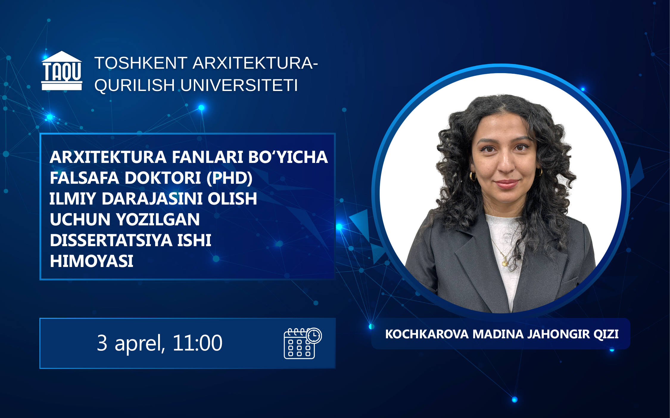 Mo’minxo’jayeva Nilufar Faxriddin qizining 18.00.01 - “Arxitektura nazariyasi va tarixi. Arxitektura yodgorliklarini ta’mirlash va tiklash” ixtisosligi bo‘yicha “O’zbekiston Islom arxitekturasi nazariyalari” mavzusidagi Arxitеktura bo‘yicha falsafa doktori (PhD) ilmiy darajasini olish uchun yozilgan dissertatsiya ishi himoyasi Toshkent arxitektura-qurilish universiteti huzuridagi ilmiy darajalar beruvchi DSc.03/2026.09.01.А.01.М raqamli Ilmiy kengashning 2026-yil 7-aprel kuni soat 11:00 dagi majlisida bo‘lib o‘tadi Manzil: Toshkent shahri, Yangi Shahar ko‘chasi, 9-uy. Toshkent arxitektura-qurilish universiteti 4-bino 5-qavatda Faollar zalida. E-mail: devon@taqu.uz Onlayn ko‘rish uchun havola: Batafsil...