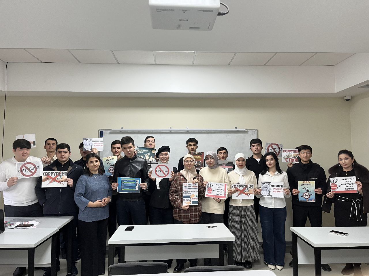Universitetning Korrupsiyaga qarshi kurashish “komplaens-nazorat” tizimini boshqarish bo‘limi tomonidan Menedjment fakulteti tyutorlari bilan hamkorlikda O‘zbekiston Respublikasi Prezidentining 2025-yil 21-apreldagi PF–71-son Farmonida belgilangan ustuvor vazifalar ijrosini ta’minlash doirasida talabalar o‘rtasida korrupsiyaga qarshi yo‘naltirilgan targ‘ibot va profilaktik tadbirlar tashkil etildi.Mazkur tadbirlar Menedjment fakulteti tyutorlari tomonidan bevosita tashkillashtirilib, ular talabalar bilan ochiq va samimiy muloqotlar o‘tkazdi. Uchrashuvlar davomida korrupsiyaning jamiyat rivojiga salbiy ta’siri, halollik va adolat tamoyillarining ahamiyati muhokama qilindi. Shuningdek, talabalarning huquqiy ongi va fuqarolik mas’uliyatini yuksaltirish masalalariga alohida e’tibor qaratildi.Tadbirlar doirasida talabalar ishtirokida korrupsiyaga qarshi mazmundagi ko‘rgazmali materiallar va plakatlar tayyorlandi. Ushbu jarayonda tyutorlar yoshlar ongida korrupsiyaga nisbatan murosasiz munosabatni shakllantirishga munosib hissa qo‘shmoqda. Mazkur tadbirlar “Korrupsiya - kelajakka tahdid” g‘oyasi asosida yoshlar qalbida halollik, adolat va mas’uliyat tamoyillarini mustahkamlashga xizmat qilmoqda.