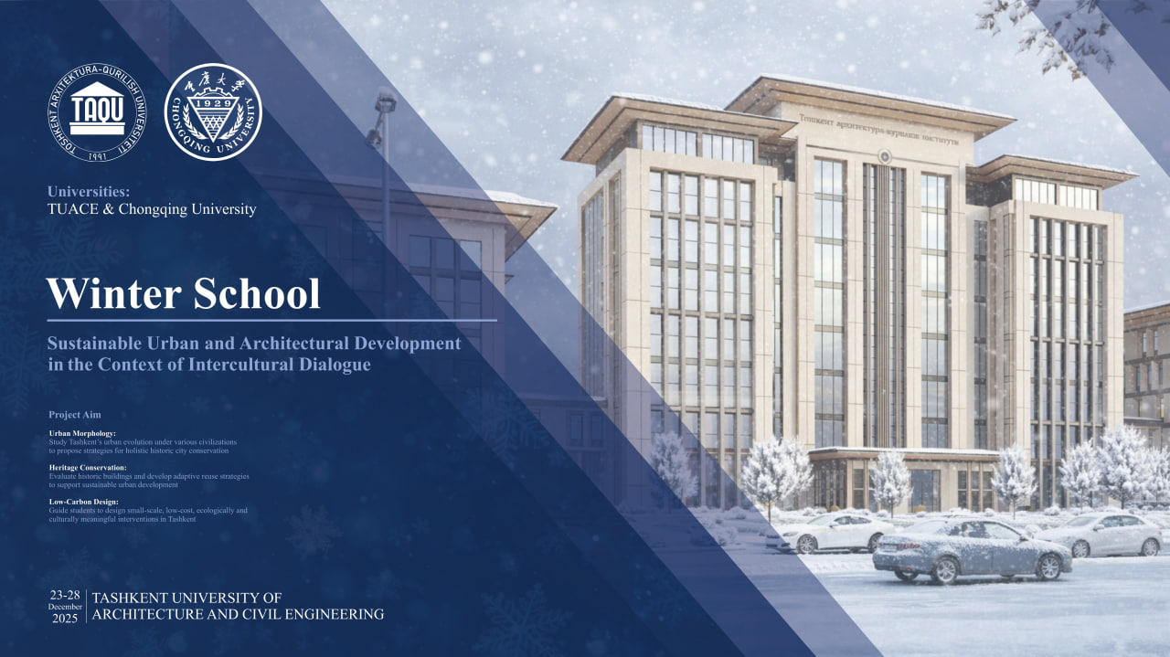 “Madaniyatlararo muloqot kontekstida barqaror shahar va me’moriy rivojlanish”.Toshkent Arxitektura va Qurilish Muhandisligi Universitetida (TAQU) Xitoy Xalq Respublikasining Chongqing University bilan hamkorlikda Xalqaro Winter School – 2025 dasturi tashkil etilmoqda.Mazkur xalqaro akademik loyiha shaharsozlik va me’morchilik sohasida barqaror rivojlanish masalalarini chuqur o‘rganish, ilg‘or ilmiy yondashuvlar va madaniyatlararo tajriba almashuvini rivojlantirishga qaratilgan.Dastur yo‘nalishlari: • Shahar morfologiyasi – turli sivilizatsiyalar ta’sirida Toshkent shahrining urban rivojini tahlil qilish; • Tarixiy merosni muhofaza qilish – tarixiy binolarni baholash va ularni moslashuvchan qayta foydalanish strategiyalarini ishlab chiqish; • Past uglerodli dizayn – ekologik, iqtisodiy va madaniy jihatdan barqaror kichik hajmdagi loyihalarni ishlab chiqish.Winter School mashg‘ulotlari xalqaro professor-o‘qituvchilar va yetakchi mutaxassislar ishtirokida olib borilib, talabalarning ilmiy-amaliy salohiyatini oshirishga xizmat qiladi.O‘tkazilish muddati: 2025-yil 23–28-dekabr Manzil: Toshkent arxitektura-qurilish universiteti (TAQU)Jadvalni ko’rish ➔ Batafsil