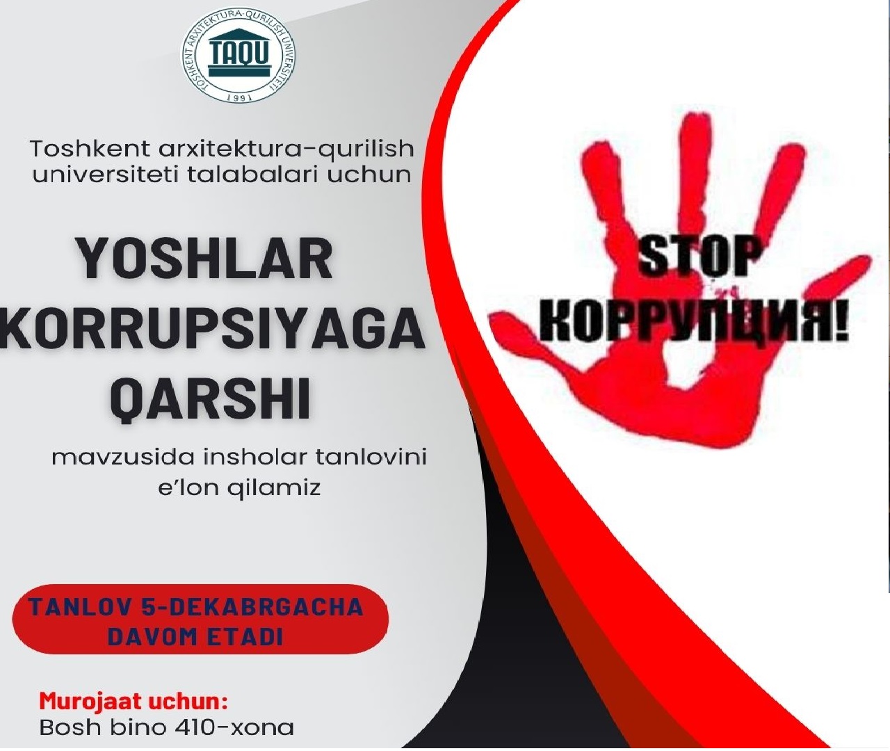 "Xalqaro korrupsiyaga qarshi kurashish" kuni munosabati bilan "Yoshlar korrupsiyaga yo'q deydi" mavzusida bo'lib o'tadigan:✅Eng yaxshi rasmlar✅Eng yaxshi insholar✅Eng yaxshi videoroliklar tanlovida ishtirok etingIjodiy ishlar 5-dekabrgacha qabul qilinadi Murojaat uchun: Bosh bino 410-xona